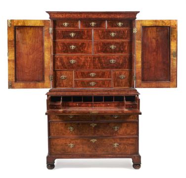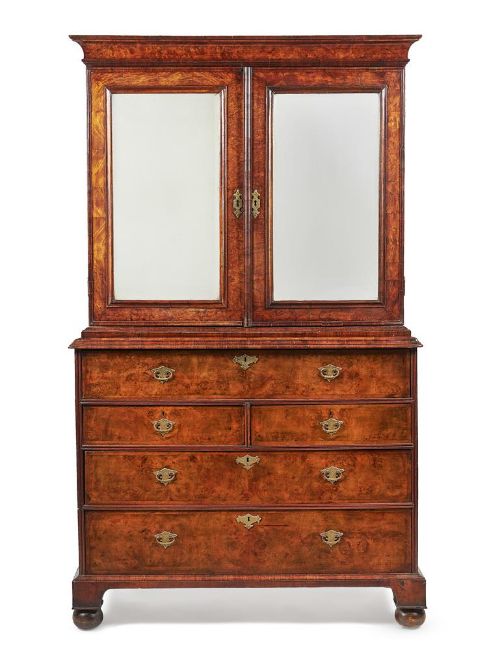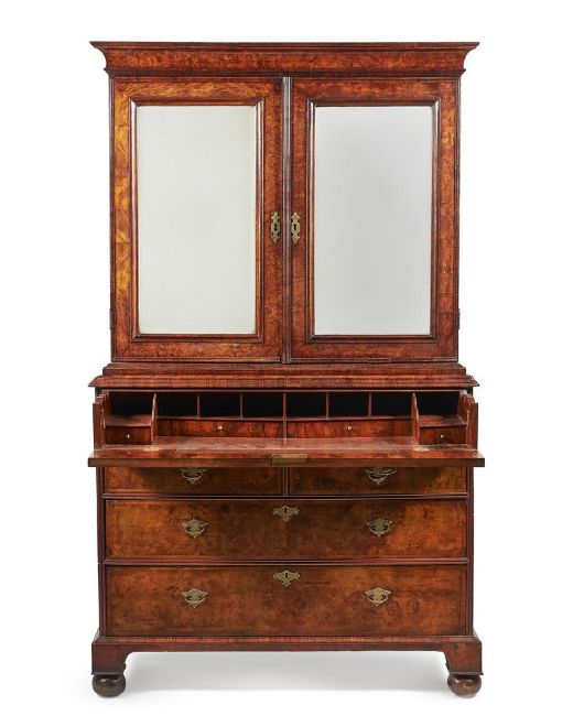 A GEORGE I FIGURED WALNUT AND FEATHERBANDED SECRETAIRE CABINET CIRCA 1720 187.5cm high, 113cm wide, 52cm deep Provenance: Sold in these rooms, Fine Furniture, Sculpture, Ceramics and Carpets, 10th December 2020, Lot 527 (£4,500 excl. BP) Condition Report: Marks, knocks, scratches and abrasions commensurate with age and use. Some old chips, splits and small losses. Handles and escutcheons are replacements but have age and are in keeping with period taste. Locks are 19th century replacements. A key is present but only operates the lock to the doors. Some fillets of later timber surrounding the lock plate to the fall. The mirror plates to the doors are later replacements Section of moulding to bottom of one door is detached but present. Some small amounts of filler used in places. Some sections of moulding re-stuck. Leather inset surface is later. Some ink/dark marks to interior of fall. Securing catches to fall are later, some small section of replacement veneer to drawer front where previous handles/escutcheons sat. Feet are later associated but are in period taste and suit the piece well It is comprised of two pieces - the upper and lower sections. Please refer to additional images for visual reference to condition. Condition Report Disclaimer