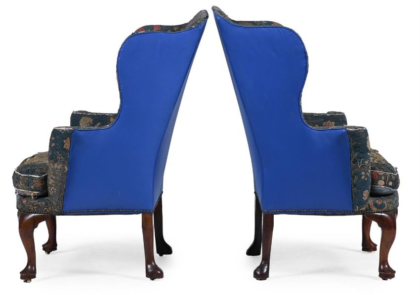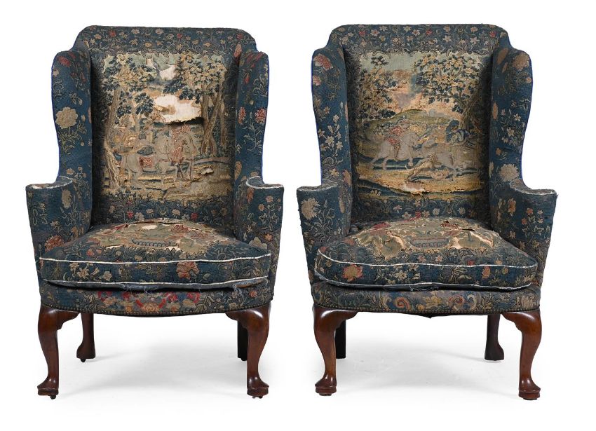 A RARE PAIR OF GEORGE I WALNUT AND NEEDLEWORK UPHOLSTERED WING ARMCHAIRS CIRCA 1725 Each chair with an inventory number to the reverse of one leg 113.5cm high, 83cm wide, 58cm deep