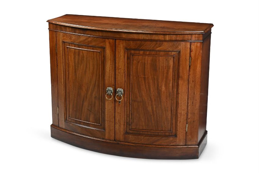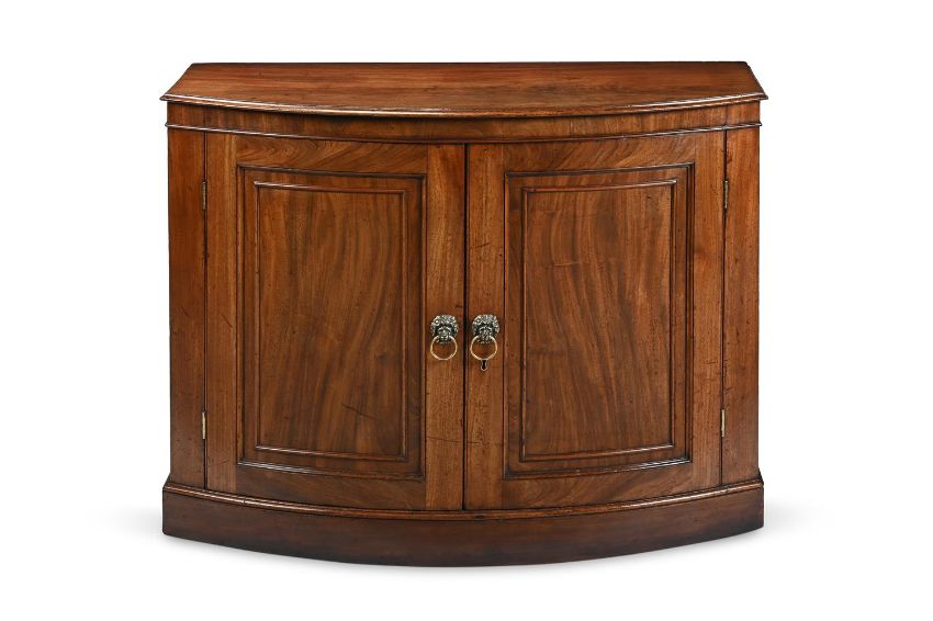 A GEORGE III MAHOGANY BOWFRONTED SIDE CABINET CIRCA 1800 The panelled doors enclosing a shelf 89cm high, 114cm wide, 45cm deep