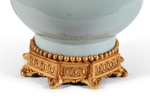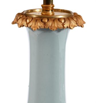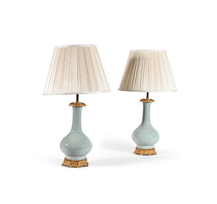 A PAIR OF FRENCH GILT BRONZE MOUNTED CELADON CERAMIC LAMP BASES MID 19TH CENTURY Now wired, with silk pleated shades 35cm high to top of bases, 61cm high overall including current shades Condition Report: Recent fitting as lamps, modern wiring and shades. Regilded. When converted for prior use underside of vases were removed. With mild wear, marks, firing spotting and scratches as per age, handling, use, and cleaning. Please see additional images for visual references to condition which form part of this condition report. All lots are available for inspection and Condition Reports are available on request. However, all lots are of an age and type which means that they may not be in perfect condition and should be viewed by prospective bidders; please refer to Condition 6 of the Conditions of Business for Buyers. This is particularly true for garden related items. All lots are offered for sale "as viewed" and subject to the applicable Conditions of Business for Buyer's condition, which are set out in the sale catalogue and are available on request.Condition Report Disclaimer