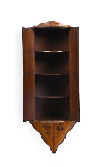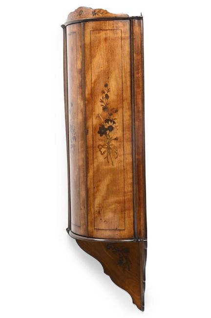 A GEORGE III SATINWOOD AND FLORAL MARQUETRY BOW FRONT HANGING CORNER CUPBOARD IN THE MANNER OF INCE & MAYHEW, CIRCA 1790 105cm high, 38cm wide, 27.5cm deep