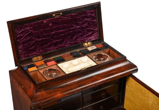 Of thorough fitted form, superstructure with lid above paints and fittings by Reeves and Woodyer, printed paper label with shop address "The King's Arms and Blue Coat Boy, No.80 Holborn Bridge London", above doors enclosing three drawers and one drawer fitted for sewing necessaires, velvet lined fold out slope below with further compartments