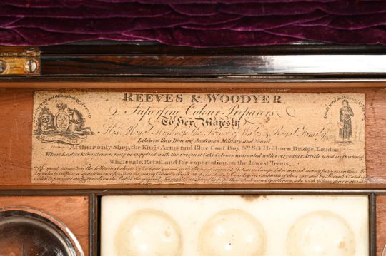 For a comparable relatively plain paint box by the firm, please see the "Watercolour box", containing watercolours in cakes, quill-pens, graphite, brushes etc. Manufactured by W J Reeves and Woodyer, 80 Holborn Bridge, London, ca. 1820 in the V&A Museum (Accession number P.19-1975, Given by Miss Pamela Hodges).