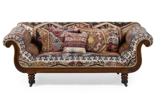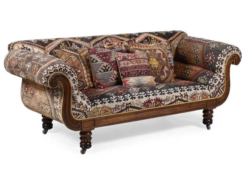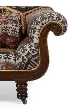 A GEORGE IV MAHOGANY AND KILIM UPHOLSTERED SOFA CIRCA 1825 With six kilim upholstered cushions 89cm high, 235cm wide, 91cm deep Condition Report: The mahogany frame of the sofa with marks, knocks, scratches and abrasions commensurate with age and use. One scroll to one arm with an old repair with filler applied to disguise. The legs with added turned timber sections to each foot to increase the height of the sofa. These additions are neatly turned and suit the piece well. The kilim upholstery with areas of fraying, discolouration, exposed weft and fading, please see all additional images. Some areas have been neatly restored. The six accompanying kilim cushions with similar areas of exposed weft and repair. Overall of solid and stable structure. Please see all additional images as a visual reference to this report.Condition Report Disclaimer