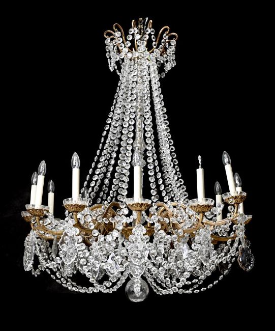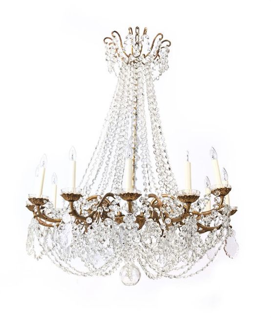 A FRENCH GILT METAL FRAMED TWELVE LIGHT CHANDELIER LATE 19TH CENTURY The whole with chains of cut or moulded glass beads 141cm high Condition Report: This lot is sold as a decorative object only - this object has been wired but must be tested and installed by an electrician prior to use. From the finishing to the ends of some of the arms and general finish, it is possible that this may date from the early 20th century. The floral drip pans of a thinner quality and slightly different colour suggests that they may be associated, possibly when the chandelier was rewired in the last 20-30 years. At this point it seems the larger drops were hung the wrong way around. Condition Report Disclaimer