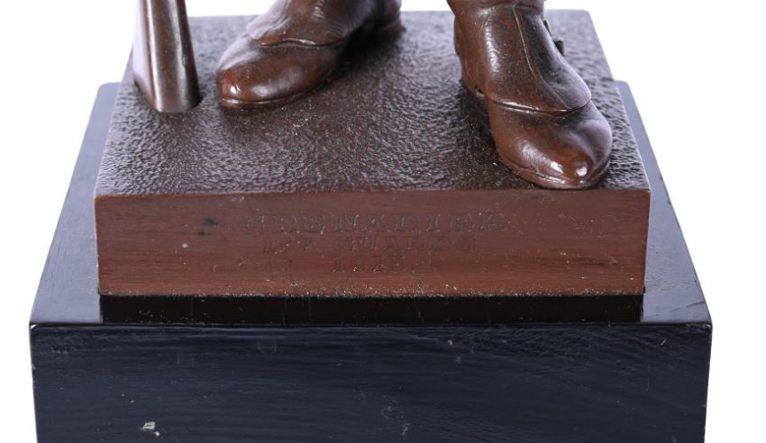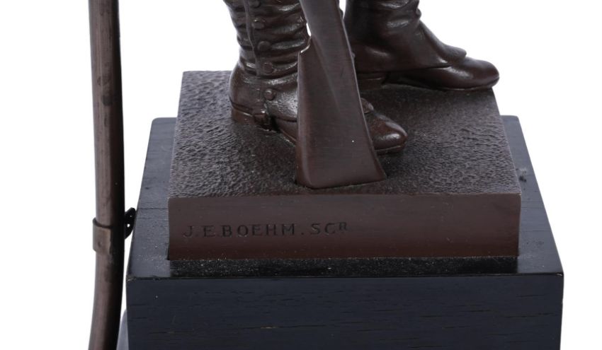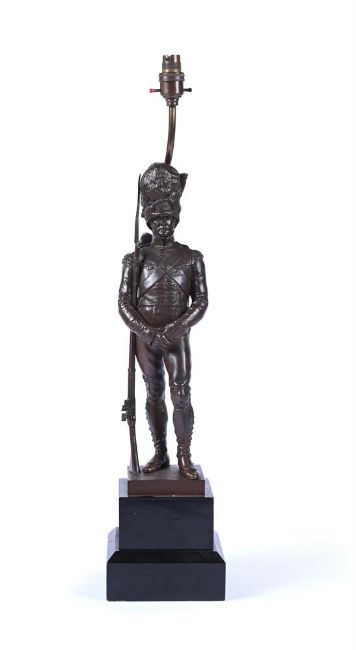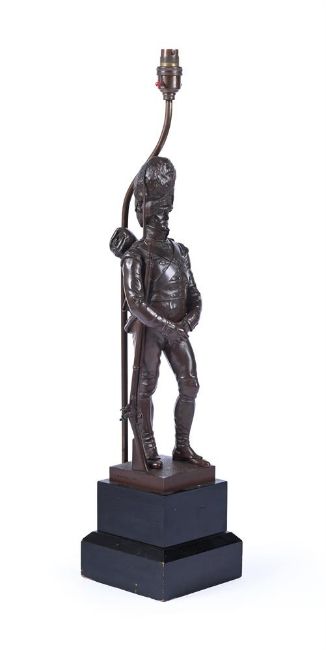 AFTER JOSEPH EDGAR BOEHM (1834-1890), A BRONZE FIGURE OF A GRENADIER GUARD CAST BY ELKINGTON, LATE 19TH CENTURY Now fitted as a lamp base, depicting a soldier of the First Guards in full uniform with a rifle, signed to cast, foundry mark and inscribed "Grenadier, 1st Guards 1815" 73cm high overall including fitment, the figure 44cm high Provenance: From the collection of the late Peter Fowler MBE, a visionary newspaper publisher who consolidated and expanded regional media in Northern Scotland