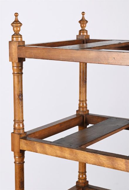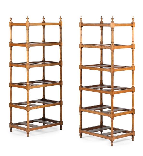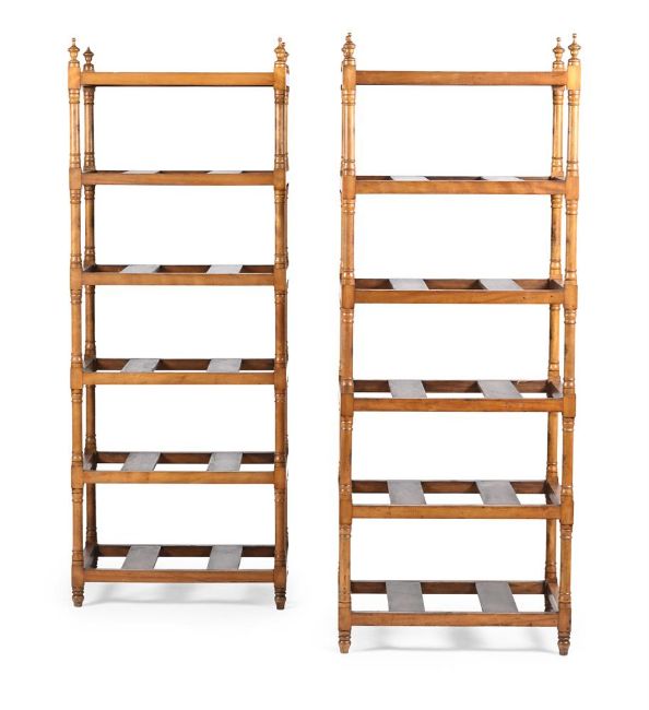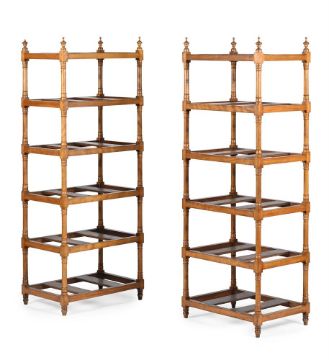 AN UNUSUAL PAIR OF VICTORIAN SATINBIRCH 'COUNTRY HOUSE' SIX TIER ETAGERES OR STANDS