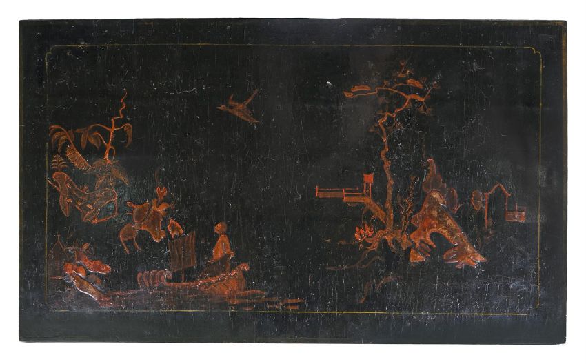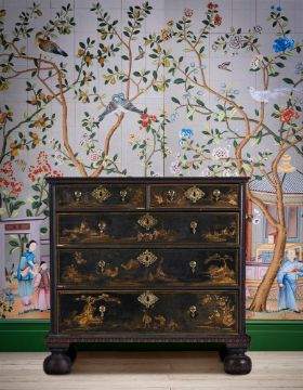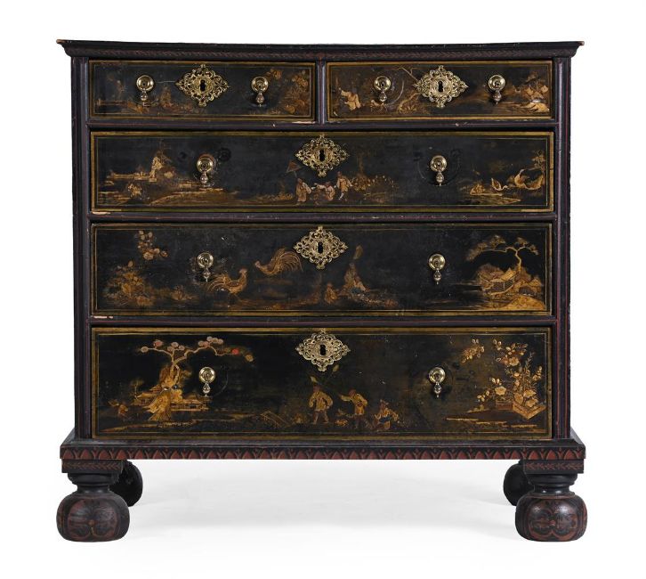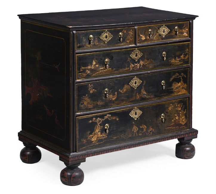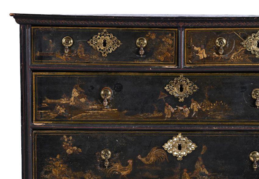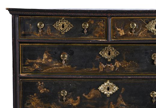 A WILLIAM & MARY BLACK LACQUER AND CHINOISERIE DECORATED CHEST OF DRAWERS CIRCA 1690 97cm high, 101cm wide, 58.5cm deepPlease note, this estimate has been updated and differs from the printed catalogue, the high estimate for this chest of drawers is £4000. Condition Report: Marks, knocks, scratches and abrasions commensurate with age and use. Various old chips, splits and losses. the lacquered and painted surface with various areas of wear, fragmentary losses, discolouration and areas of retouching. It is likely that the beaded moulding, the lower skirt, upper moulding and feet are all alter redecorated in the 19th century. The feet are later replacements and are in keeping with the aforementioned 19th century redecoration. The handles and escutcheons are associated but are in period taste and suit the piece well. There is evidence of previous handle fixtures to the reverse of the drawer fronts and subsequent 'shadows' to the draw fronts where this previously sat. The top with additional areas of craquelure and loss it has a more polished surface then the rest of the piece. Some evidence of old worm. Overall of pleasing, muted tone and decoration.Condition Report Disclaimer