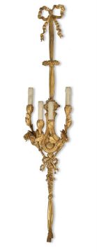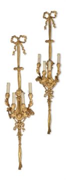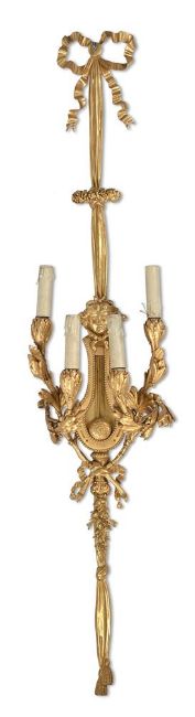 A LARGE PAIR OF ORMOLU FOUR LIGHT WALL LIGHTS IN THE MANNER OF BEURDELEY, 20TH CENTURY Each with ribbon cresting above backplate with central lyre shaped section, mask above twisted entwined fabric below, supporting four laurel branches 133cm high overall, 27.5cm wide across the arms Condition Report: With wear, marks, knocks and scratches as per age, handling, use, and cleaning. Protrude 16.5cm at deepest point Wired for electricity with drilled nozzles and applied wires- but sold as decorative items only and will require testing and rewiring by professional electrician. Rubbing to gilding and dirt accretion, reverse shows construction joint marks between sections- one branch slightly green/yellow at one point indicating either heat damage or possible repair. Please see additional images for visual references to condition which form part of this condition report. All lots are available for inspection and Condition Reports are available on request. However, all lots are of an age and type which means that they may not be in perfect condition and should be viewed by prospective bidders; please refer to Condition 6 of the Conditions of Business for Buyers. This is particularly true for garden related items. All lots are offered for sale "as viewed" and subject to the applicable Conditions of Business for Buyer's condition, which are set out in the sale catalogue and are available on request.Condition Report Disclaimer