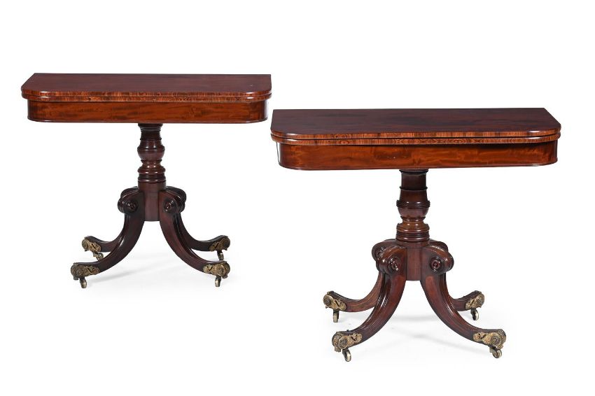 Y A PAIR OF REGENCY MAHOGANY AND KINGWOOD TEA TABLES CIRCA 1815 With cross-grain kingwood moulding 74.5cm high, 92cm wide, 44.5cm deep