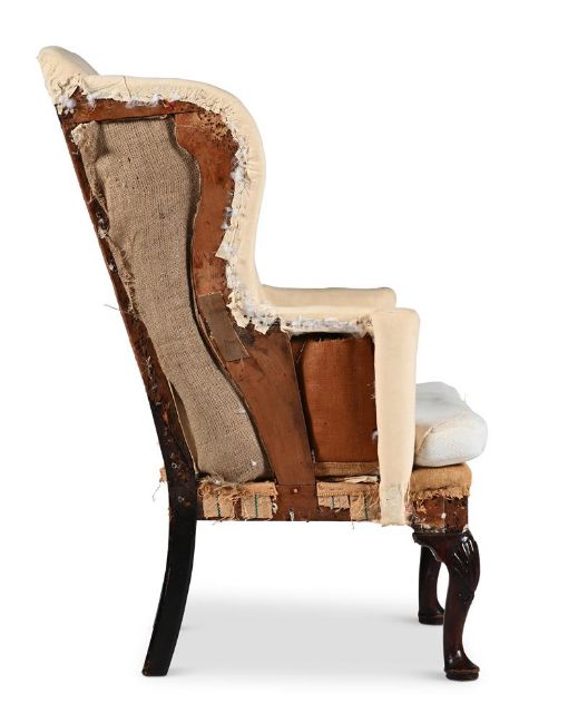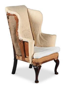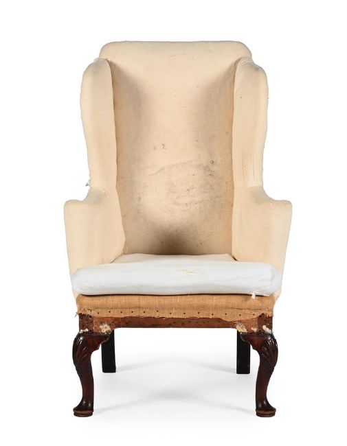 A GEORGE II MAHOGANY WING ARMCHAIR CIRCA 1730 113cm high, 71cm wide, 80cm deep overall Condition Report: Marks, scratches and abrasions, some old chips and splits comensurate with age and use. Some minor old losses. some old repairs. Some additional wear to the feet that the appearance could easily be remedied with colouring by a restorer. The calico covering bears marks, dirt and staining. Various loose elements of calico and 'sacking' cloth so the chair basically needs re-upholstering. No breaks or splicing to legs. The seat rails are original. Atleast one of the two corner brackets to the interior corners of the seat rail is a replacement. The rear stretcher likely has a slender section of later timber above the rail. There is evidence of old worm damage with some resultant loss in areas throughout as expected for age and use. The rear seat rail has been affected more significantly by worm so may require some support or restorative work prior to re-upholstery. Beyond this the chair is generally of solid structure. Some joints may benefit from 'tightening' (especially whilst reachable prior to re-upholstery. Dreweatts cannot guarantee the originality of timber that is not visible (ie concealed beneath upholstery) Much of the frame that is visible (as the reverse of the chair is not covered) appears original with some later repairs. Additional note added 30-11. The feet have previously been fitted with castors and are now lacking. Please refer to all additional images for visual reference to condition. They are a vital part of the condition reportCondition Report Disclaimer
