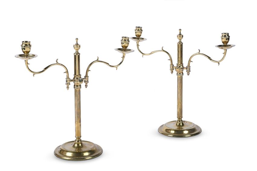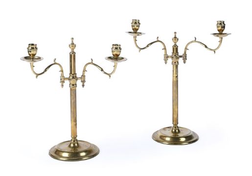 A PAIR OF GEORGE III ADJUSTABLE BRASS DOUBLE CANDLESTICKS MID TO LATE 18TH CENTURY 36cm high Provenance: From the collection of the late Peter Fowler MBE, a visionary newspaper publisher who consolidated and expanded regional media in Northern Scotland Condition Report: With wear, marks, knocks and scratches as per age, handling, use, and cleaning. Old polish remnants, some nozzle distortions, movement slightly stiff- old wear from handling to frames Please see additional images for visual references to condition which form part of this condition report. All lots are available for inspection and Condition Reports are available on request. However, all lots are of an age and type which means that they may not be in perfect condition and should be viewed by prospective bidders; please refer to Condition 6 of the Conditions of Business for Buyers. This is particularly true for garden related items. All lots are offered for sale "as viewed" and subject to the applicable Conditions of Business for Buyer's condition, which are set out in the sale catalogue and are available on request.Condition Report Disclaimer