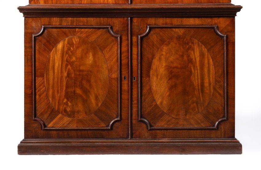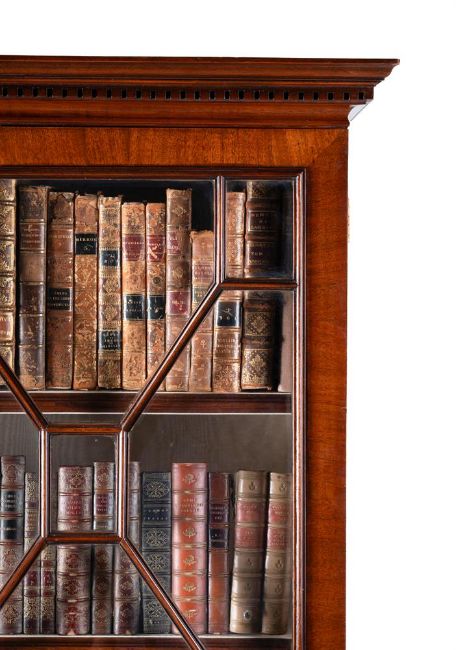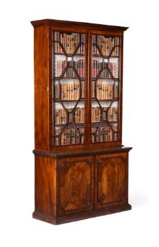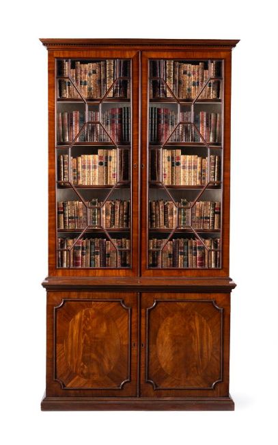 A GEORGE III MAHOGANY LIBRARY BOOKCASE CIRCA 1770 With astragal glazed doors, the lower cabinet section opening to an adjustable shelved interior 229cm high, 124.5cm wide, 46cm deep Provenance: An important private collection, acquired Sotheby's London, Important English Furniture 12 February 1999, lot 74  Condition Report: With marks, knocks, scratches and abrasions commensurate with age and use Some minor old chips and losses Of pleasing colour and mahogany figuring overall, and of neat compact proportions A key is present and operates both locks to the upper and lower sections The locks are later replacements The glass panes free from any noticeable cracks or defects The cream lining in good, presentable order Some neat, old repairs to the bottom of the glazed sections, including the moulding and veneers, see images for extentCondition Report Disclaimer