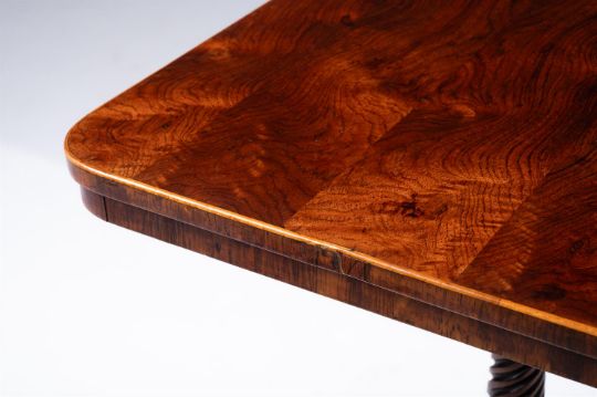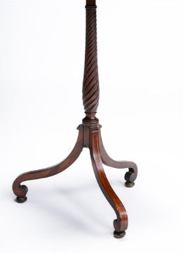 Y A PAIR OF REGENCY ROSEWOOD AND LINE INLAID OCCASIONAL TABLES CIRCA 1815 With brass feet 74cm high, 41.5cm wide, 41cm deep Condition Report: Marks, knocks, scratches and abrasions commensurate with age and use. Some old splits and chips. Some old repairs. The tops, with some old darker marks as expected for age and use. The rosewood veneer has been applied to the tops in strips to maximise the figuring which is a good sign of high quality. The tops with a polished, presentable appearance. The brass feet are a nice addition to the occasional tables and show another sign of high quality. To the top of one leg there is a partial split that has not gone through the leg, this has been secured through the assistance of the metal bracket to the underside. Please see all additional images as a visual reference to this report. Condition Report Disclaimer