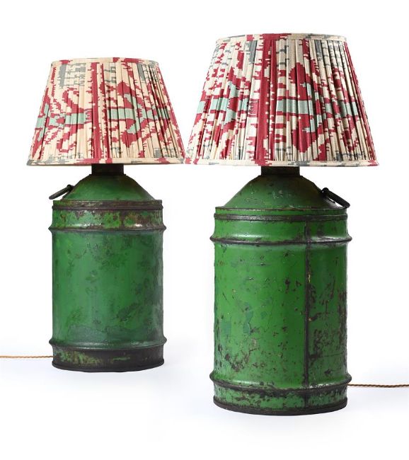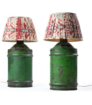 A PAIR OF TOLE PEINTE TABLE LAMPS MID 20TH CENTURY AND LATER Converted from oil cannisters, complete with Ikat style shades, rewired and Pat tested 78cm high overall including shades
