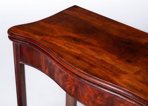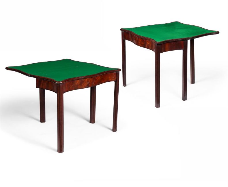 A PAIR OF GEORGE III MAHOGANY SERPENTINE CARD TABLES CIRCA 1780 75cm high, 87cm wide, 42.5cm deep Condition Report: Marks, knocks, scratches and abrasions commensurate with age and use Some old minor chips and splits Some old repairs, including to veneers The timber of pleasing colour and patina utilising high quality veneers Of pleasing compact and neat proportion The baize playing surface to both tables has been replaced and is generally tidy with some minor wear in areas Evidence of old worm to rear friezes Solid and stable overall Please see all additional images as a visual reference to condition.Condition Report Disclaimer