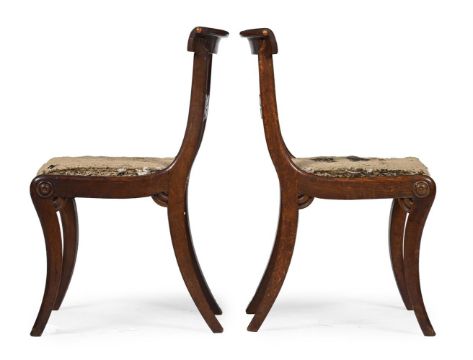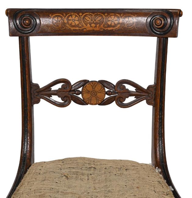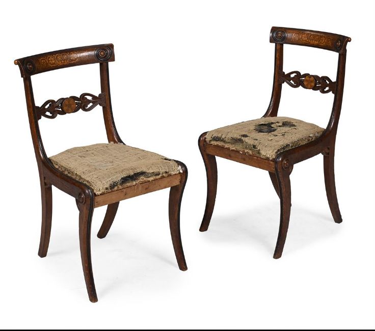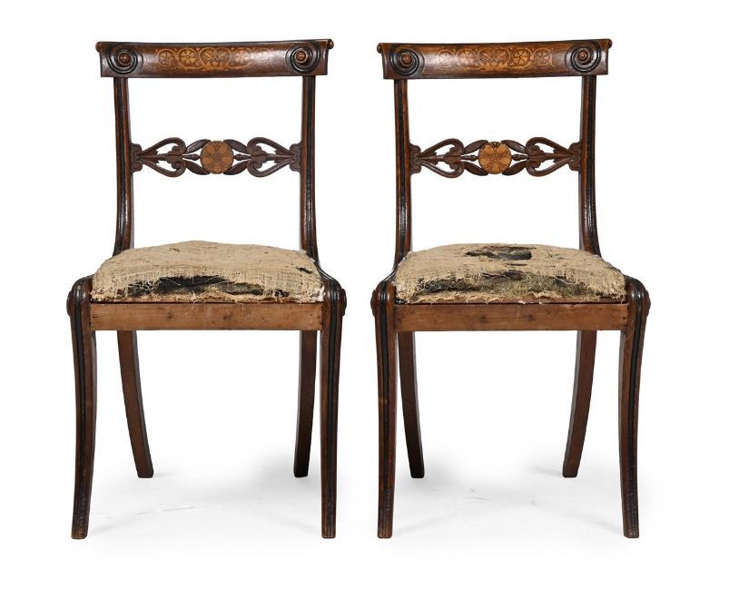 A PAIR OF REGENCY OAK AND MARQUETRY CHAIRS ATTRIBUTED TO GEORGE BULLOCK, CIRCA 1815 82.5cm high, 46.5cm wide, 52cm deep Condition Report: The sketch for this chair can be seen in a volume of the Wilkinson Tracings titled 'Tracings by Thomas Wilkinson from the designs of the late Mr George Bullock 1820', which is housed in the Birmingham Museum Trust. ID. 28144. 1974M3.5 Wilkinson Tracing, Design for Seven Chairs.Marks, knocks, scratches and abrasions commensurate with age and use. Some old splits and chips. Some old glue repairs. Some evidence of old worm. A carved element to the cross rail of one chair is broken, however this is a clean break and this missing element is present with this lot. A qualified restorer will be able to reattach this element easily. The numbers 'VI' and 'VIII' present to both back seat rails, suggesting these were part of a longer set. Two round securing sections of timber are present to the front and back of the seat rails to secure the drop-in seat. One has been replaced. Please see images. It is likely that the front rails were previous covered by upholstery, or a strip of moulding was present, this is now lacking. Evidence of old tack marks staples and pins used to secure previous upholstery. Both drop-in seats stripped, both showing signs of wear and exposing horsehair filler underneath. An old repair to one central medallion on the back splat.Please see all additional images as a visual reference to this report. Condition Report Disclaimer