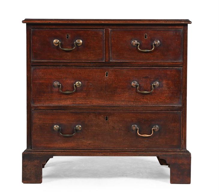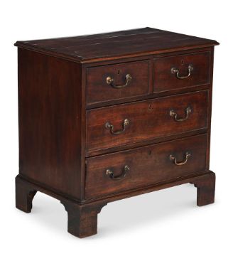 A GEORGE III MAHOGANY CHEST OF DRAWERS IN THE MANNER OF THOMAS CHIPPENDALE, CIRCA 1770 With 'S' shaped escutcheons, the chest overall of compact proportions 74cm high, 76cm wide, 48cm deep overall Condition Report: With marks, knocks, scratches and abrasions commensurate with age and use Some old chips and splits The top with a historic split running approximately one half of the width, the appearance of this could be improved by the attention of a sympathetic restorer Some old veneer repairs, most notably to corners and extremities The front right bracket foot is a later replacement but is well constructed and fits the piece well, there are some additional replacements and repairs to the other front foot The interior of the top two drawers with a later baton of timber applied The handles are original, the locks have age and could be period replacements, no key present, all locks open Of neat compact proportion, and of solid stable structure Please see all additional images as a visual reference to condition.Condition Report Disclaimer