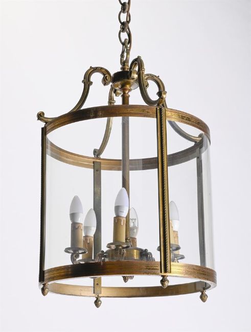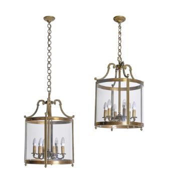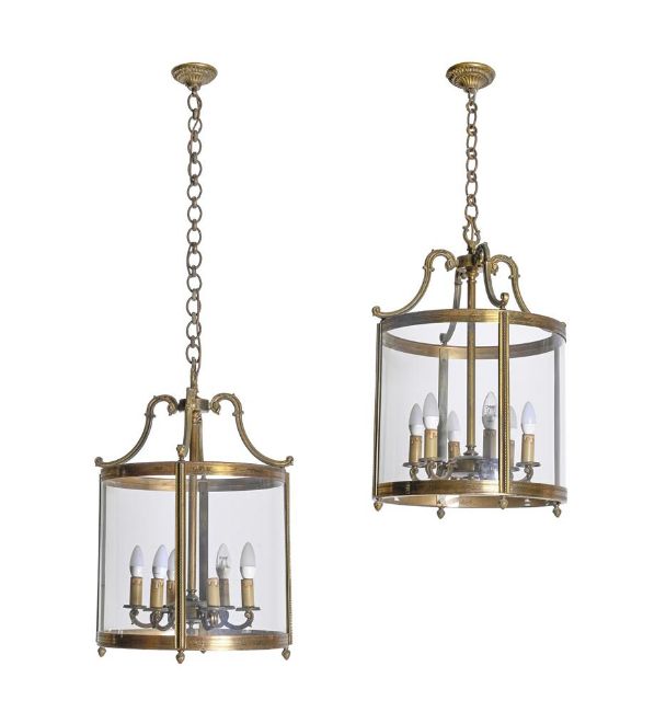 A LARGE PAIR OF BRASS DRUM LANTERNS IN GEORGE III STYLE, 20TH CENTURY Possibly French, fitted for electricity 70cm high, 49cm wide Condition Report: Condition is generally good, although the metal is dirty and will benefit from a clean. The glass is seemingly in good condition. There are occasional small, random paint splashes, but these are very minor. Sold as a decorative object only and will require professional rewiring before installation.  Condition Report Disclaimer