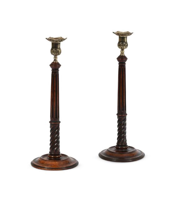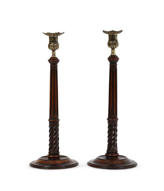 A PAIR OF GEORGE III MAHOGANY AND BRASS MOUNTED CANDLESTICKS CIRCA 1790 38.5cm high