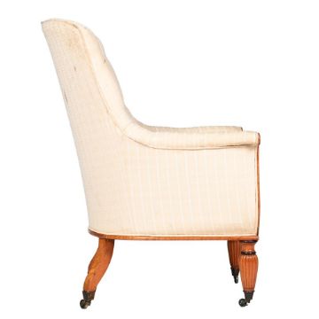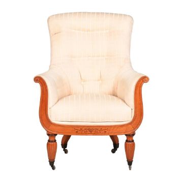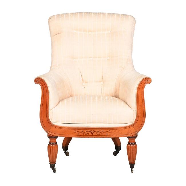 A SATINWOOD AND BIRD'S EYE MAPLE LIBRARY ARMCHAIR ENGLISH OR FRENCH, CIRCA 1820-1830 With stencilled mark to the front seat rail 'EW 474' 109cm high, 79cm wide, 77cm deep Provenance: Crawford Priory, Fife, Scotland