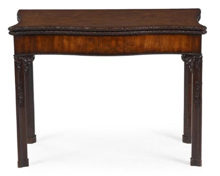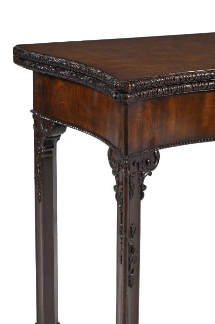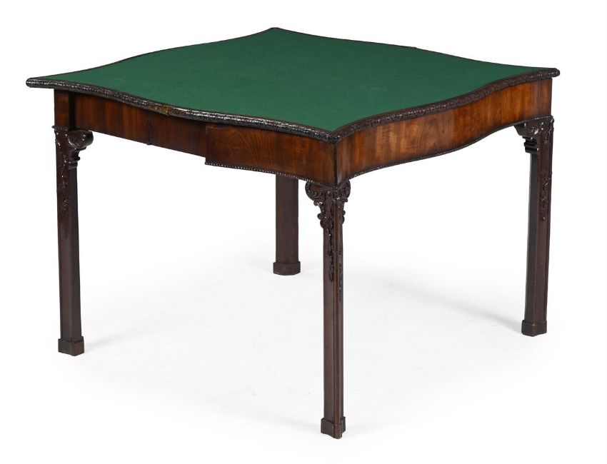 A FINE GEORGE III CARVED MAHOGANY SERPENTINE CONCERTINA ACTION CARD TABLE ATTRIBUTED TO WRIGHT & ELWICK, CIRCA 1760 70.5cm high, 99cm wide, 38.5cm deep The finely carved detailing to the moulded edge, the corner brackets and the trailing foliate carved legs are all intricate features often associated with the Wakefield-based partnership of Wright and Elwick, who completed many important commissions in Yorkshire such as Nostell Priory, Temple Newsam and Wentworth Woodhouse. For two closely related card tables see Christie's London, Important English Furniture (6522), 29th November 2001, Lot 218 (£14,687 incl. BP) and Important English Furniture (7234), 8th June 2006, Lot 39 (£21,600 incl. BP). For a serving table attributed to Wright & Elwick with very similar carved brackets, see Sotheby's New York, Provenance & Patina: Important English Furniture from a West Coast Collection, 18th June 2024, Lot 1058 ($14,400 incl. BP). Condition Report: Old marks, scratches and abrasions comensurate with age and useSome old chips and splits. The figured timber of very high quality and attractive. Good colour and patination. The 'ears' to the rear legs appear to be later replacements but match very well.The two metal brackets to one side of the interior frieze of the concertina action appear to be replacements and there are vacant holes visible adjacent. Some later screws securing some brackets and top to the frieze from beneath as most often seen. A very high quality table of its date and form. The carving is of extremely high quality and of a standard associated with the best makers of the period. The way in which the carved branches appear to 'grow around' the legs is a charming and admirable feature. Please refer to all additional images available via email for visual reference to condition . They are a vital element of the condition report. Condition Report Disclaimer