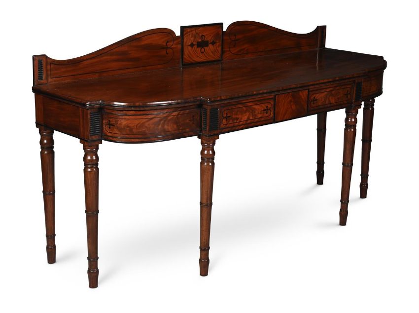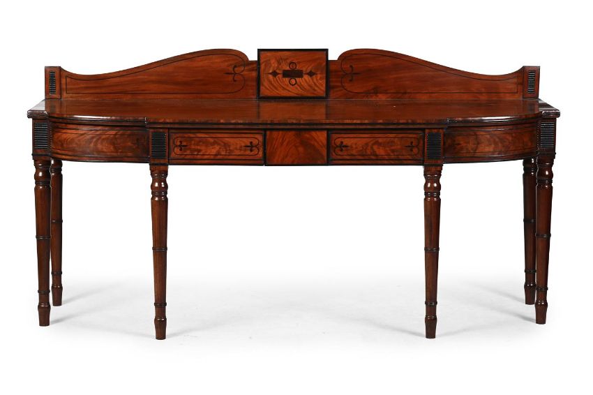 Y A REGENCY MAHOGANY AND EBONY STRUNG SERVING TABLE CIRCA 1815 With two frieze drawers 111.5cm high, 214cm wide, 70.5cm deep