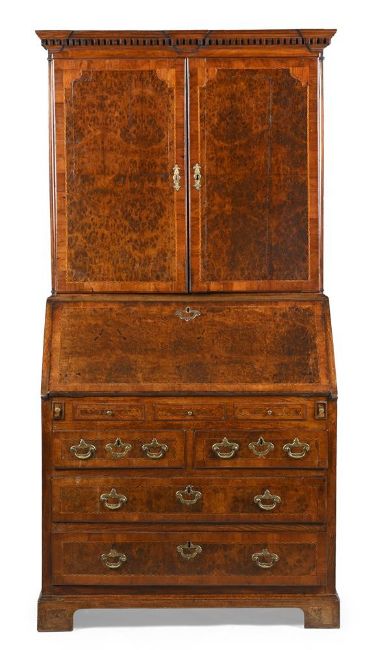 A GEORGE II POLLARD OAK, WALNUT AND CHEQUER BANDED BUREAU CABINET CIRCA 1740 199cm high, 101cm wide, 50cm deep