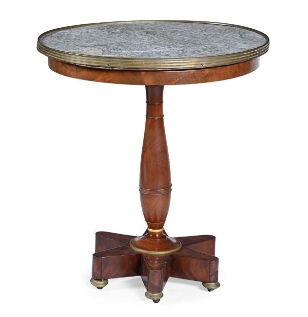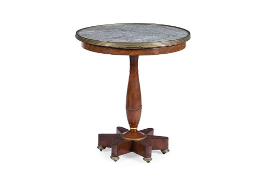 A BALTIC MAHOGANY AND BRASS MOUNTED OCCASIONAL TABLE OR GUERIDON 19TH CENTURY With a Vert D'Estours marble top 73.5cm high, the top 66.5cm diameter Condition Report: Marks, knocks, scratches and abrasions commensurate with age and use Some old chips and splits Some old repairs The marble top with some natural variegation with yellow and pink tones within (see images) The top is fixed in position Upon close inspection, the collar at the base of the stem with some old cracks and repair - this could be disguised further to be virtually invisible Some join lines are visible at the ends of some of the feet - one foot with a neat veneer repair including some filler and glue repairs The underlying oak floor of the the top with some old splits Please see all additional images as a visual reference to condition.Condition Report Disclaimer