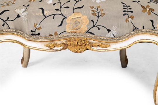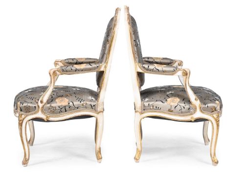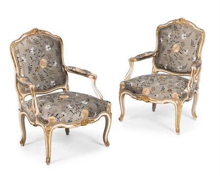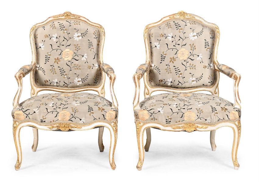 A PAIR OF LOUIS XV CREAM PAINTED AND PARCEL GILT ARMCHAIRS CIRCA 1760 With embroidered silk upholstery 94cm high, 68cm wide, 51cm deep Condition Report: Marks, knocks, scratches and abrasions commensurate with age and use Some old chips and splits The painted and parcel gilt surface has been refreshed at some point, it generally remains bright and clean with some areas of wear, fragmentary loss and fading The underside of the seats with corner brackets applied to provide stability to the joins. Both chairs have been later sprung prior to reupholstery (see images) The upholstery with some wear, thinning and discolouration Both chairs solid and which have been painted and gilded over making. Please see all additional images as a visual reference to condition. Condition Report Disclaimer