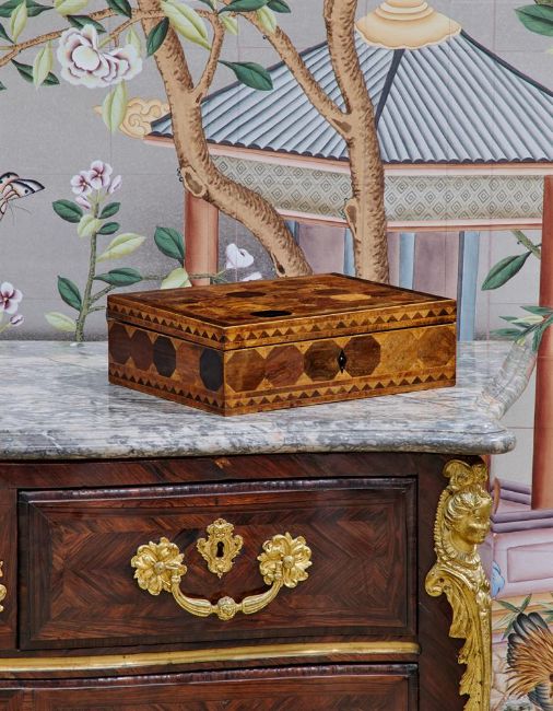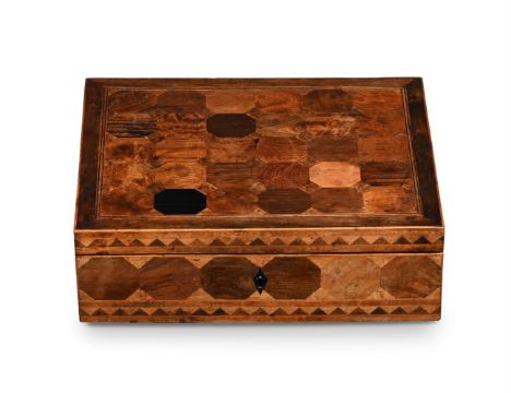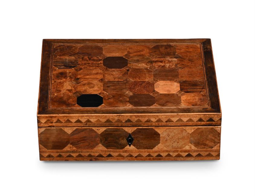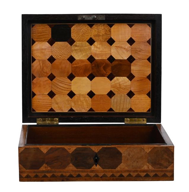 Y A RARE GEORGE III SPECIMEN TIMBER PARQUETRY BOX ALMOST CERTAINLY BY GILLOWS, CIRCA 1810 Containing approximately 72 wood specimens to all sides and the interior, opening to mahogany lined storage 10cm high, 30cm wide, 25cm deep Provenance: Private Collection, UK, until 2022A very similar box is in the Judges' Lodgings Museum, Lancaster; purchased in 2005 from the London dealership Harris Lindsay with V & A Purchase and Art Fund grants. It was made for Miss Elizabeth Gifford (or Giffard) of Nerquis Hall, near Mould in Flintshire in 1808, and is fully documented in the Gillows Estimate Sketch Book for that year, at a total cost £7. 8s. 1d. As documented in 2011 by Adam Bowett for The Regional Furniture Society, the aforementioned Gifford specimen box and the present lot contain approximately seventy-two different specimen timbers, highlighting the unrivalled position of Gillows in furniture making and the exotic timber trade. It is believed that only a small number of these Gillows specimen timber boxes were produced and this is a rare example to be offered at auction. Condition Report: Marks, knocks, scratches and abrasions commensurate with age and use Some minor old chips and splits to a small number of veneers Some fading to external specimens, the colour of which could be improved with sympathetic restoration from a qualified restorer. The internal specimens remain bright and clear, with good colour and figuring A key is present and operates the lock Baize lining to the underside. Overall in very good condition for its age and scarcity. Please see all additional images as a visual reference to condition Condition Report Disclaimer