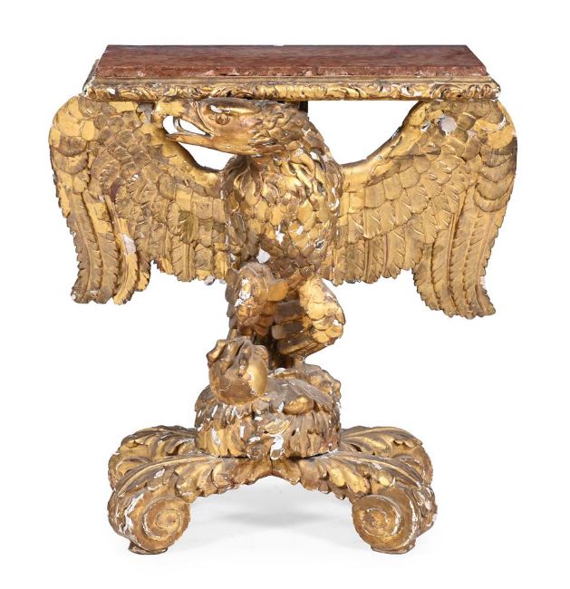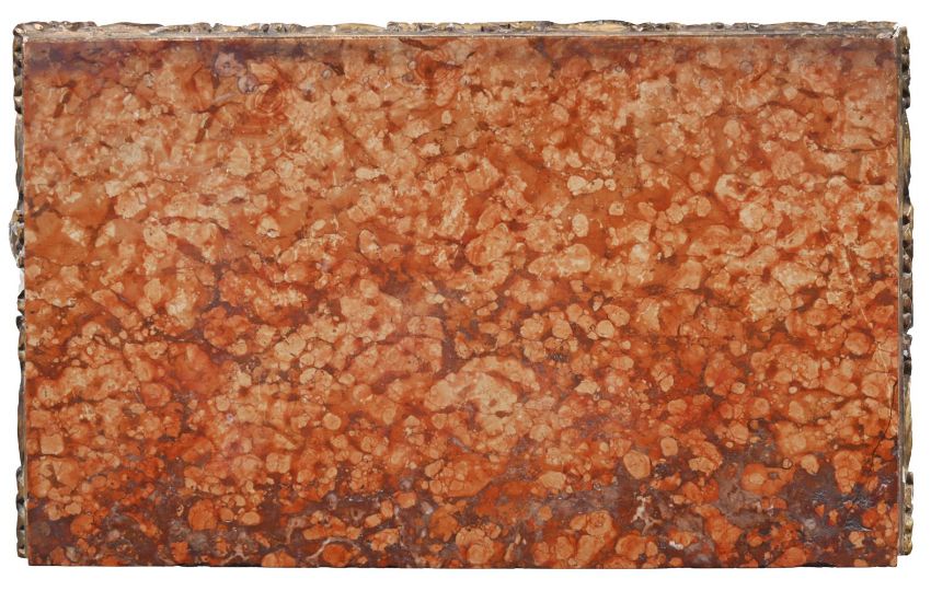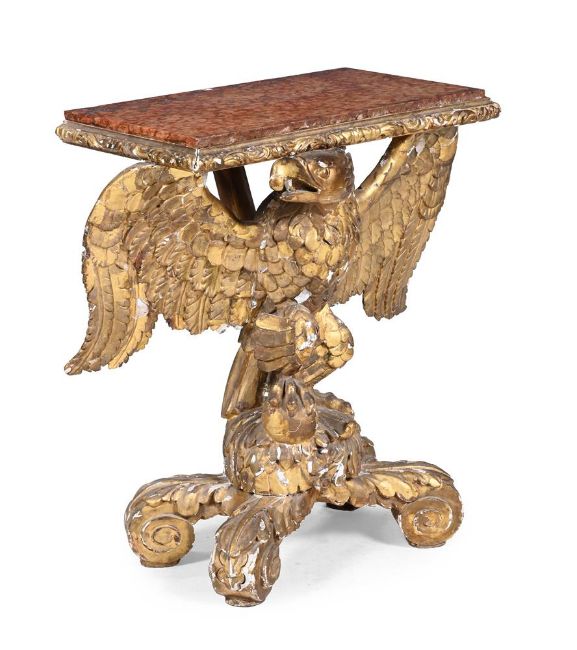 A CARVED GILTWOOD AND ROUGE GRIOTTE CONSOLE TABLE IN THE MANNER OF WILLIAM KENT, MID 18TH CENTURY AND LATER 84cm high, 78cm wide, 48cm deep Provenance: Sold Bonhams London, Fine English Furniture (20743), 20th November 2013, Lot 40 (£6,875 incl. BP) For a console table closely comparable in design - most notably the auricular base - see Christie's London, Jasper Conran: The Collection Part I (20027), 14th September 2021, Lot 122 (£32,500 incl. BP). Condition Report: Marks, knocks, scratches and abrasions commensurate with age and use Various old chips, splits and losses, including to the gilded surface The marble top is later associated - it has a glued repair to one corner and various other 'nibbles' and fragmentary loss to extremities It is probable that the top has been reduced in width to provide better stability for the once oversailing top - this is not entirely uncommon Some old repairs throughout, some movement to the moulding of the top, otherwise solid and stable overall Please see all additional images as a visual reference to condition. Condition Report Disclaimer