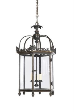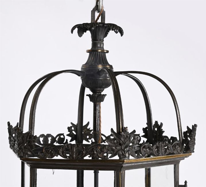 A GEORGE IV PARCEL GILT BRONZE HEXAGONAL LANTERN CIRCA 1825 Crisp upper cresting above later fitted electrical fitment within glazed sides and door 71cm high, 37cm wide Condition Report: The whole with cleaning which has largely removed original gilded surface however elements of surface still retain original lustre. Wholly reglazed and later electric light fitment which has PAT to mid 2024 and therefore will require retesting and possibly rewiring by professional electrician. Door works, screw replacements, small repair to one section of top cresting Condition Report Disclaimer