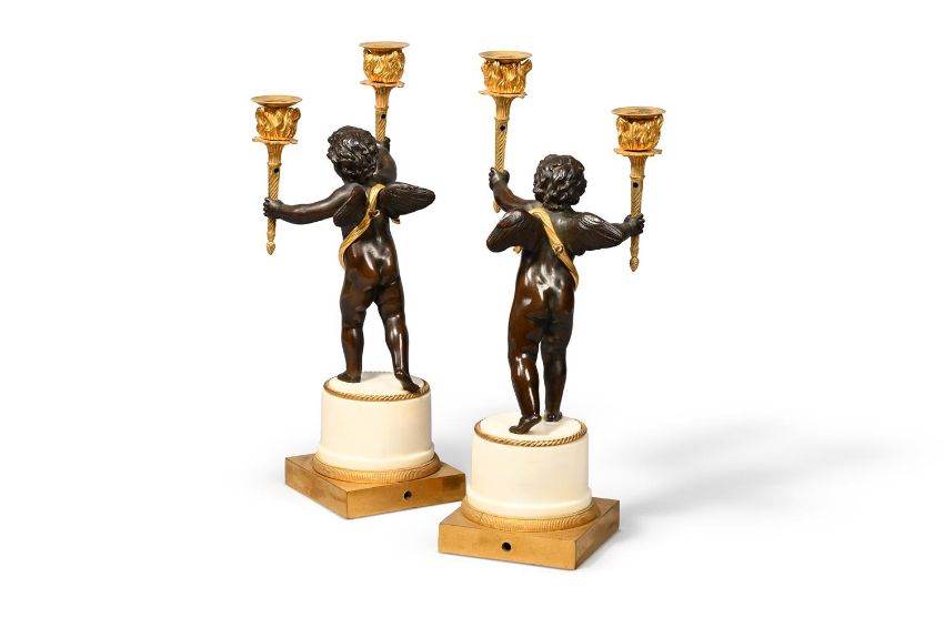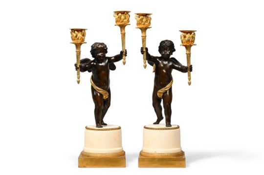 A PAIR OF FRENCH GILT AND PATINATED BRONZE CHERUB TWIN LIGHT CANDELABRA CIRCA 1780-1820 Each figure holding twin ormolu candle sconces, on circular white marble plinths 42cm high, the bases 13cm square Condition Report: With wear, marks, knocks and scratches as per age, handling, use, and cleaning.Formally fitted for electricity with drill hole visible to reverse of torches and at base of nozzles and with later applied wire holding screws to back of each figure. Some rubbing to bronze patina but generally quite dark in colour, some replacement screw mounts. Drilled later holes to base of plinths. And rubbing to gilding notably nozzles and around bases. Please see additional images for visual references to condition which form part of this condition report. All lots are available for inspection and Condition Reports are available on request. However, all lots are of an age and type which means that they may not be in perfect condition and should be viewed by prospective bidders; please refer to Condition 6 of the Conditions of Business for Buyers. This is particularly true for garden related items. All lots are offered for sale "as viewed" and subject to the applicable Conditions of Business for Buyer's condition, which are set out in the sale catalogue and are available on request. ELECTRICAL GOODS. These are sold as decorative items only and if bought for use must be checked over for compliance with safety regulations by a qualified electrician before use. Condition Report Disclaimer