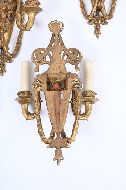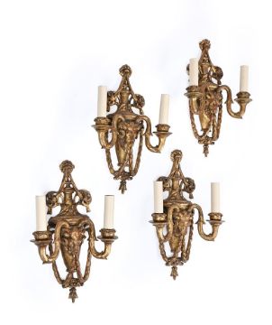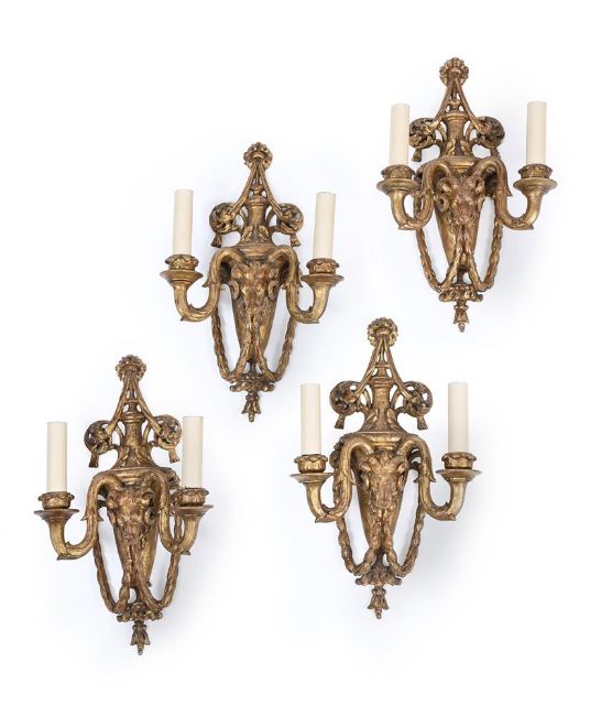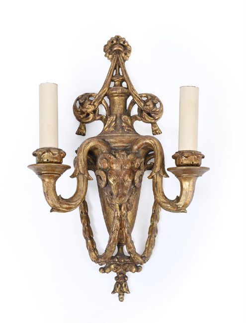 A SET OF FOUR CARVED GILTWOOD TWIN LIGHT WALL LIGHTS PROBABLY ITALIAN, 19TH CENTURY Each with a vase backplate with a central ram head issuing trailing floral chains 46cm high, 28.5cm wide, 11.5cm deep