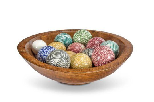 A SYCAMORE BOWL WITH CARPET BOWLS EARLY 19TH CENTURY The bowl 13cm high, 42.5cm diameter with twelve assorted polychrome carpet bowls and a jack bowl Condition Report: Bowl with natural wear from use, marks and old scratches and stains. Small areas of dents and wear and loss to edge. Bowls- all with marks and small fritting from use- small spot repainting Condition Report Disclaimer
