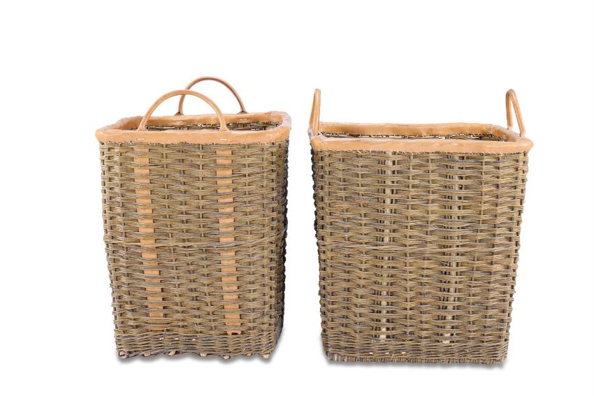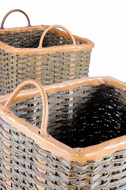 A LARGE PAIR OF LEATHER BOUND WICKER LOG BASKETS LATE 20TH OR MODERN Of rectangular form, each with a pair of handles 80cm high, 71cm wide, 65cm deep Condition Report: The leather handles and banding dirty, worn and discoloured but in sound condition. The wicker dirty, discoloured and worn with some splits and minor losses. Structurally sound sand ready to use. Condition Report Disclaimer
