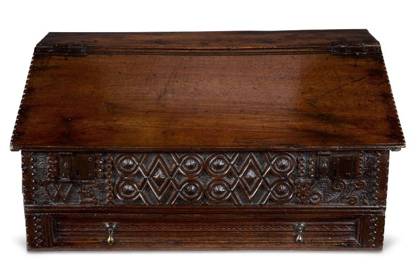A WILLIAM AND MARY OAK AND ASH DESK OR DOCUMENT BOX WESTMORLAND, DATED 1695 The hinged chip-carved slope-front enclosing three short drawers, the front with a frieze of interlaced strapwork forming roundels and diapers, dated 1695 and initialled 'WE' and with twin locks, with a channelled long drawer below 39cm high, 82cm wide, 48cm deepTogether with an associated carved angel pediment, 14cm high, 62cm wide Provenance: The box Mr & Mrs, H. Beedham, sold Bonhams, Oxford, 13 May 2015, lot 414, where acquired by the present owner.