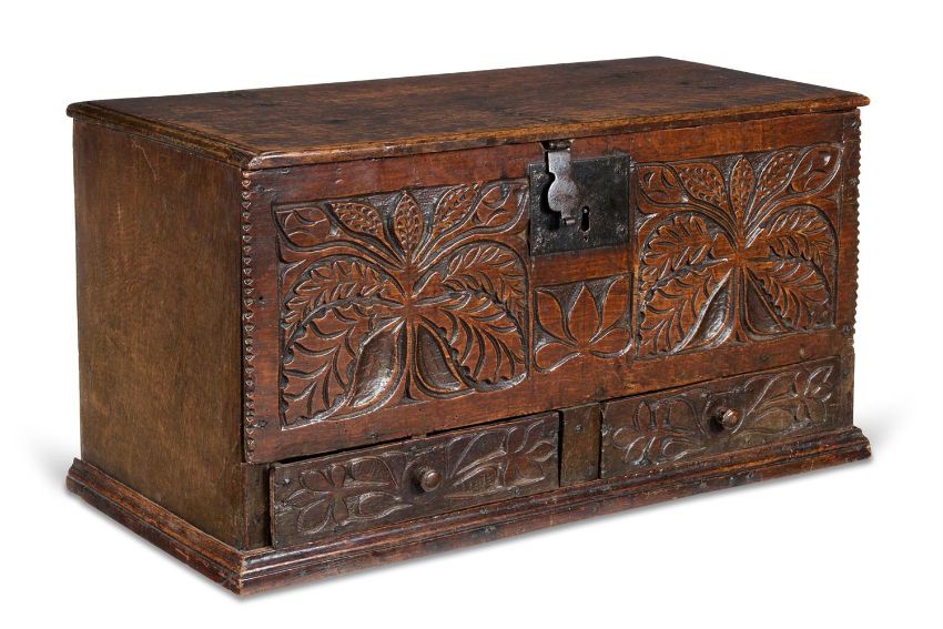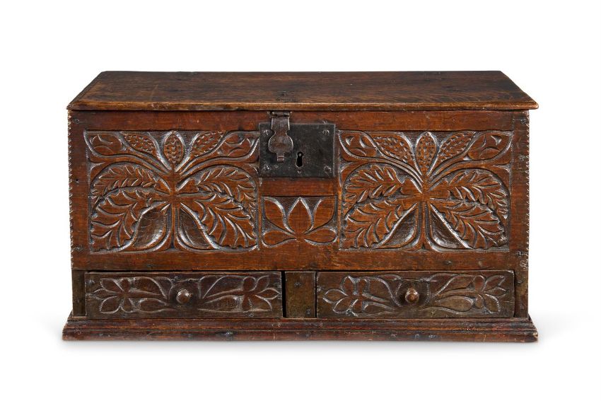 AN OAK SMALL CHEST OR DOCUMENT BOX WELSH, PROBABLY GOWER, EARLY 18TH CENTURY With a hinged lid, the front carved with twin panels of leafy branches and with two drawers below, each secured by a concealed peg 32cm high, 62cm wide, 29cm deepProvenance: Acquired from Rod Wilson, Petworth, January 2002. Anonymous sale, Bonhams, Oxford, 21-22 January 2015, lot 417 where acquired by the present owner. Condition Report: Marks, knocks, scratches, abrasions consistent with age and use. The top associated. Possibly reduced in height, probably had stile legs or feet previously, drawers appear to have been re-lined, strap hinges to the top have come away to one side and will need resecuring Condition Report Disclaimer