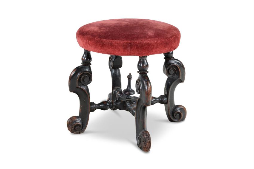 A WILLIAM AND MARY EBONISED FRUITWOOD STOOL CIRCA 1690 The circular padded seat on scrolled 'horsebone' legs joined by turned stretchers with a central finial 39cm high, 37cm diameterProvenance: Anonymous sale, Bonhams, Oxford, 3 June 2014, lot 459, where acquired by the present owner Condition Report: Good, structurally secure with wear and tear consistent with age and use. The seat re-covered. Losses to the ebonised decoration and old worm in at least two feet with some consequent losses. Condition Report Disclaimer