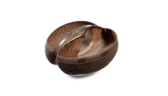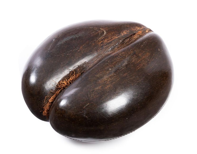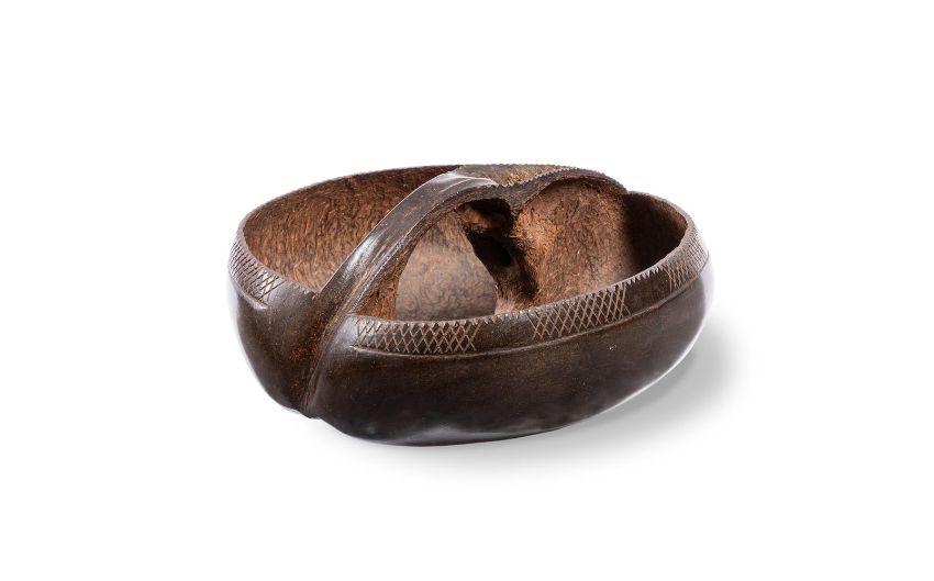 Y  A COCO DE MER [LODOICEA MALDIVICA] Part cut away and polished, now as table basket 28 x 30.5cm Saleroom Notice:Please note that this lot contains CITES Condition Report: Dirty, signs of contact wear to base. Slightly unusual muscle shaped mark. Paint spotting, the original natural hair probably trimmed and slightly frayed. Condition Report Disclaimer