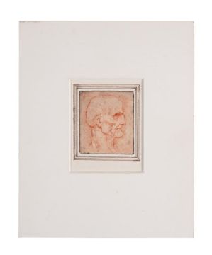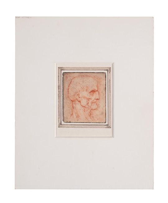 AFTER LEONARDO DA VINCI HEAD OF A MAN IN PROFILE Red pencil The sheet 8.5 x 7.5cm (3¼ x 2¾ in.) Unframed After the original drawing in the British Museum. Condition Report: The sheet has been laid down. With some very minor losses and wear to the extreme edges, including a small folding crease to the upper left corner. Light discolouration and black blemishing to the sheet (see online illustration). There is a surface scratch (approx. 5cm) running parallel to the left edge. Condition Report Disclaimer