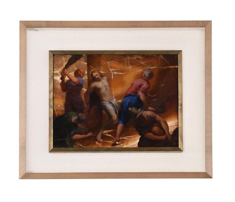 The alabaster has cracked in several places (visible in online and catalogue illustrations), and there is some associated retouching which is visible in a natural light. Rubbing and abrasions to the framing edges, with a number of small losses and chips to the extreme edges. The largest being to the upper left corner (approx., 5mm). Surface scratches, scuffs, and some pitting to the picture surface. Inspection under UV light reveals scattered retouching throughout, together with in-filling and overpainting to the aforementioned cracks.