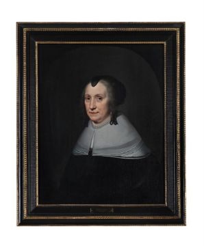 CIRCLE OF ISAAC LUTTICHUYS (ENGLISH 1616 - 1673) PORTRAIT OF A LADY WITH A DOUBLE ROW OF PEARLS Oil on panel Dated '1649' (centre right) 57 x 71cm (22¼ x 27¾ in.)Provenance: Sale, Christie's, London, 17 July 1986, lot 39
