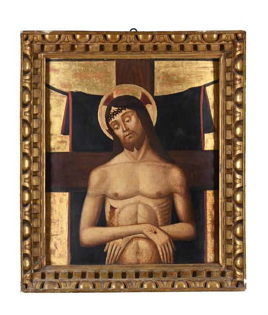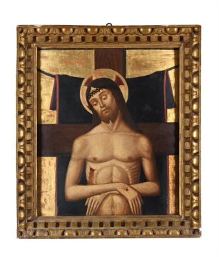 FOLLOWER OF GIOVANNI SANTI CHRIST AS THE MAN OF SORROWS Oil on panel 61.5 x 52cm (24 x 20¼ in.)Provenance: Don Carlo Giovene, Duke of Girasole Condition Report: The panel has bowed and presents a few damages to the edges. UV light reveals a few scattered retouches on the torso, most notably at the centre of the chest where a patch of approx.. 3 cm in diameter is present. Further retouching is visible in the hair, as well as in the black cloth behind Christ. Condition Report Disclaimer