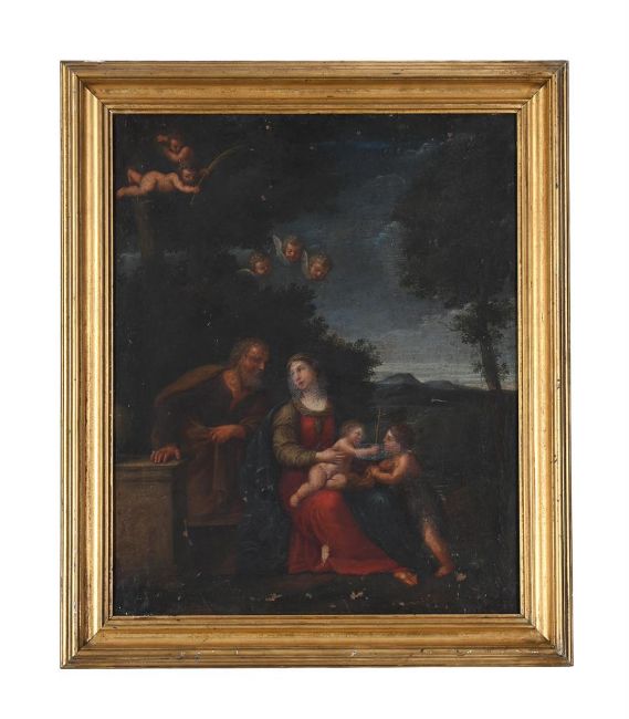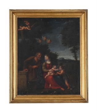 FOLLOWER OF FRANCESCO ALBANI THE HOLY FAMILY WITH THE INFANT SAINT JOHN THE BAPTIST Oil on canvas 53 x 43.5cm (20¾ x 17 in.) Provenance: Sir Horace Rumbold, 9th Bt.Sir Horace Rumbold was a British diplomat and served as ambassador in Berne, Warsaw, Madrid and Berlin. Condition Report: The canvas has been lined. Stretcher marks are present. Craquelure throughout with some areas of lifting and associated paint losses, most notably to the lower section, to the Virgin's clothing, to the sky and the upper foliage. Various scuffs and scratches which are most concentrated in the lower section. A more prominent vertical scratch of approximately 3cm is present to the lower left corner with associated loss. White cloudy stains are present to the Virgin's visage and between the Christ Child and John the Baptist, possibly caused by a discoloured varnish. Further brown staining to the lighter pigments in the sky. Inspection under UV reveals a thick green, unevenly applied varnish, which has pooled in some areas. While the masking varnish is likely to conceal some previous restoration, some areas of retouching and strengthening do fluoresce under UV, including to Joseph's face, right hand and cloak, to the Virgin's right hand, to the Christ Child and John the Baptist's left arm. There are further larger areas of restoration to the pedestal, foliage, sky and between the figures. Condition Report Disclaimer