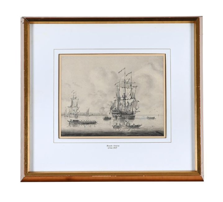 ATTRIBUTED TO FRANCIS SWAINE (BRITISH CIRCA 1720 - 1782) FRIGATES IN A HARBOUR Pen, ink and wash Bears signature (lower right) 18 x 22cm (7 x 8½ in.) Provenance: Sale, Maynards, Canada, International Art & Sculpture, 6 March 2024, lot 91