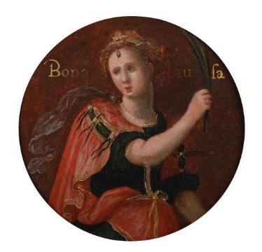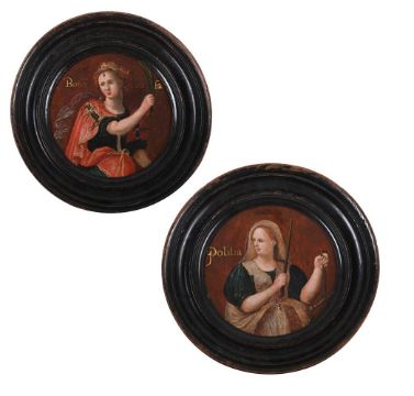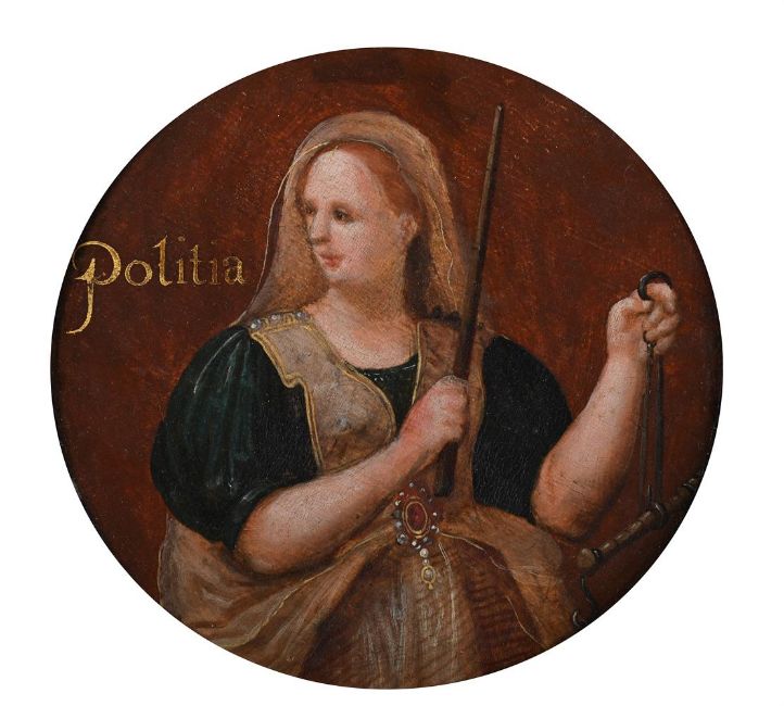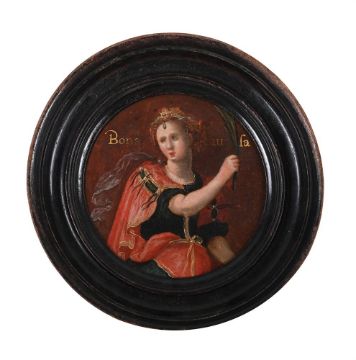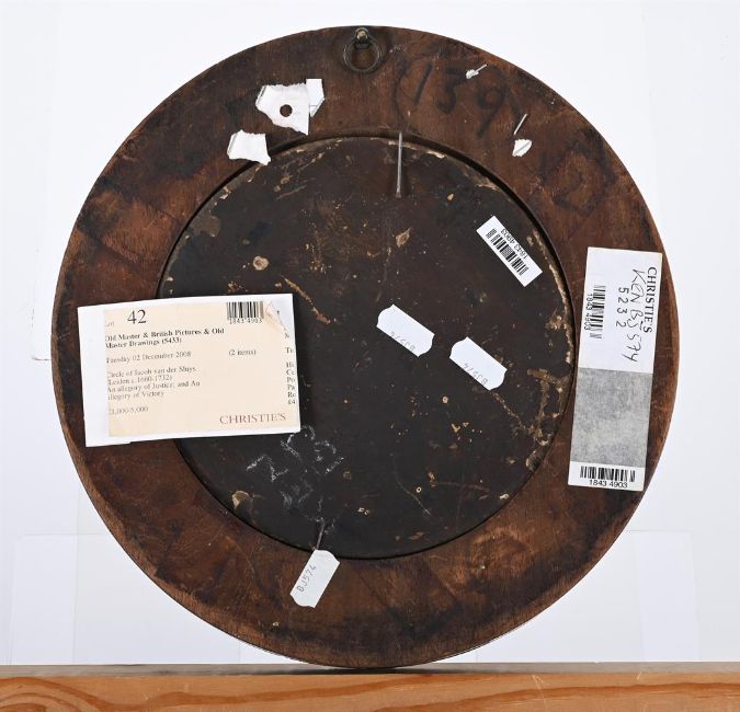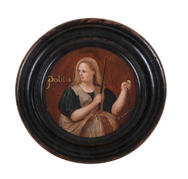 CIRCLE OF JACOB VAN DER SLUYS (DUTCH CIRCA 1660 - 1732) ALLEGORY OF JUSTICE; ALLEGORY OF VICTORY Oil on panel, tondo, a pair Inscribed 'Politia' and 'Bona cause' (centre and centre left, respectively) Each 18 x 18cm (7 x 7 in.) (2) Provenance: Sale, Christie's, London, Old Master & British Pictures & Old Master Drawings, 2 December 2008, lot 42