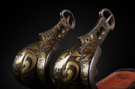 ‡  Property from the Collection of Jean SaportaA pair of abumi [stirrups]Momoyama period - Edo period, late 16th -17th century of typical form, the stirrups inlaid in bronze with tomoe-mon, shells, seaweed and flowing water, red lacquer interiors each 27.5 cm. long Emblazoned with tomoe-mon heraldic crests, these stirrups are decorated with seaweeds among swirling waters in low-relief sprinkled gold lacquer (hiramaki-e). The tomoe-mon, thought to represent a stylised magatama [curved bead], functions as a protective emblem. The present iteration is known as mitsudomoe [triple tomoe] and is associated with Shinto shrines and martial families. The lavish ornamentation of warrior accoutrements and horse trappings reflects a long tradition of heroic imagery in Japanese literature. Twelfth century battles in the Tale of Heike (Heike monogatari) describe the opulent armour, swords, and saddles of the warring Heike and Minamoto clans. During the Edo period (1615-1868), as the warrior class became the ruling administrators under the Tokugawa shogunate, such accoutrements grew even more elaborate. Here, the russet iron stirrups are densely decorated in gold lacquer on the exteriors, with a functional application of a simple red lacquer coat to the interiors.   Condition Report: A few small pieces of bronze inlay missing, the red lacquer interiors well-worn with use.Condition Report Disclaimer