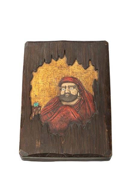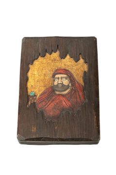 ‡  Property from the Collection of Jean SaportaA shikishi-bako [box for square poem paper]Signed Gyonen hachijuichi-o Muchuan zo (made by Muchuan, old man of eighty-one)Edo period, 19th century  the patinated cypress wood rectangular box and flush-fitting cover with canted corners, the wood carved in high and low relief with an irregular opening depicting Daruma on a crackled gold ground, the figure inlaid in wood and decorated in various coloured pigments and lacquer, the seated figure beside a green two-handled incense burner (koro) on a wood stand, the reverse of the cover with a rat and a further rat beside a flywhisk, the interior of the base with a mukugiyo (cowbell) and ruyi scepter, black lacquer interiors, silver fundame rims 28 x 20 x 6 cm. Provenance:Michael Tomkinson (1841-1921)  Literature:E. Gilbertson et. al., A Japanese Collection made by Michael Tomkinson, (London, 1898), no. 643.Joe Earle and Edmund J. Lewis, Shadows and Reflections: Japanese Lacquer Art from the Collection of Edmund J. Lewis at the Honolulu Academy of Arts, (Honolulu, 2004), p. 74-75, no. 27. The imposing figure of Bodhidharma (Daruma) appears through an opening in the decaying wooden wall of a temple. The natural grain and weathered surface of the wood are used to striking effect, reinforcing the contrast between the wood exterior and gold ground interior. Bodhidharma is rendered in relief in red lacquer for the robes and brown lacquer for his hair and facial details. A small ceramic incense burner (koro) is placed on a table to the left. The interior of the lid is decorated with a rat and a Buddhist priest's fly whisk (hossu); a second rat crouches within an opening in the wall. On the interior of the base are a temple gong (mukugyo) with its hammer and a cloud sceptre (nyoi), arranged side by side. The writing box bears the signature Gyonen hachijūichi-o Muchuan zo ('made by Muchuan, old man of eighty-one'). Although the name Muchuan and the seal Kan were used by Ogawa Haritsu (Ritsuo, ) [see Lot 29], the style and techniques employed here - namely the use of togidashi-e [burnished raised maki-e] - are not characteristic of his work. The box is therefore more plausibly attributed to a nineteenth-century artist working in a Ritsuo inspired manner. Condition Report: As can be seen in the illustration, there are a few cracks to the wood of the cover, the interior with two small chips to the edge of the cover and a further chip to the bottom left-hand corner, some slight dents to the sides along the base edge. Condition Report Disclaimer